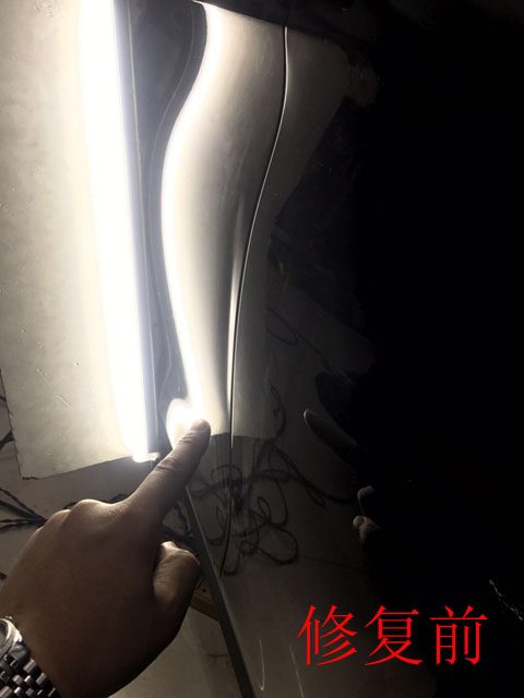 通過圖片可以看出奔馳車門凹陷位于右前門,而且呈線狀凹陷,修起來有一定難度,奔馳車主再三叮囑不要拆卸車身任何零部件,因此我們只能從車身外部利用拉拔等方式進(jìn)行修復(fù)!