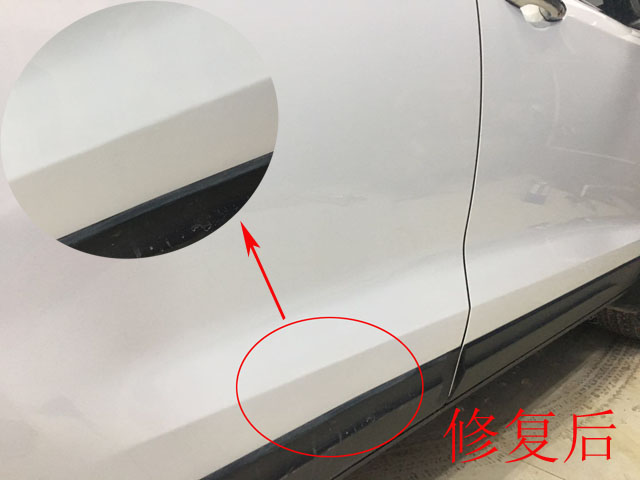 從圖中車門凹痕放大處可以看出,凹痕發(fā)生在車門下方棱線處,修復(fù)車身平面凹陷容易,想這用棱線部位的凹陷,并且還在車門下方邊緣處,因此想修復(fù)奔騰車門凹痕是有一定難度的,不過來我們濟(jì)南皇菠蘿修復(fù)這種難度的凹陷還是挺有經(jīng)驗(yàn)的!